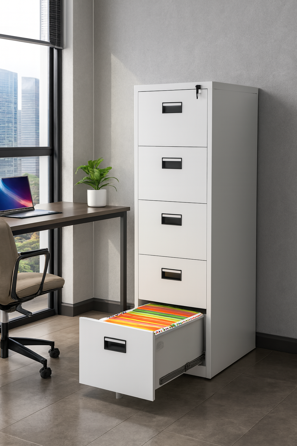 The 4-drawer layout provides generous storage space for both A4 and foolscap-size files. Each drawer features adjustable hanging rails, enabling you to customize your filing system based on your office needs. The vertical design saves floor space while maximizing storage capacity — perfect for compact offices where efficiency and organization are essential.